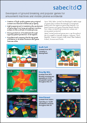 Brief (Sabec): To create a datasheet, aimed both at intellectual property owners and games system licensees, to promote Sabec Limited's range of branded games.